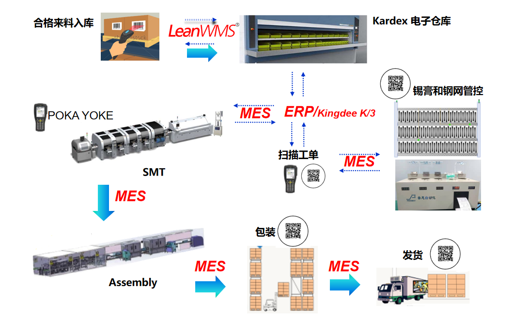 健科電子的制造管理系統由PLM,WMS,ERP,MES系統組成。WMS連接Kardex智能倉儲系統,實現物料的先進先出;ERP系統與PLM對接,將產品BOM導入ERP,實現物料的防錯管理;MES系統實現整個生產過程的管控、記錄以及生產數據的分析。