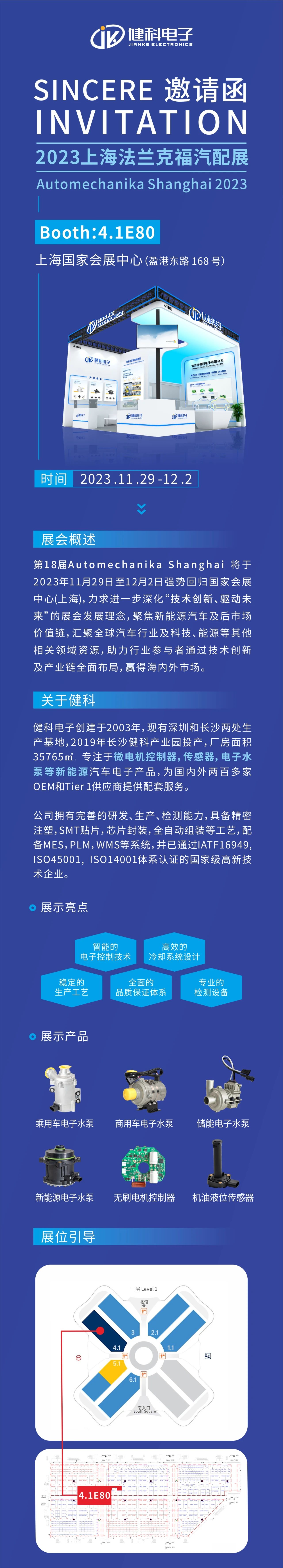 5月17日,深受業界矚目的“2023北京國際商用車及零部件展覽會”暨“2023北京國際道路客貨運輸車輛及零部件展覽會”在北京 · 中國國際展覽中心(新館)盛大開幕!健科電子攜自主研發的電子水泵、車用微電機控制器、傳感器閃耀亮相,與全球客戶及合作伙伴分享創新技術及行業應用成果。